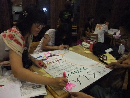 そして生産者と消費者が一緒のグループになって、フェアトレードの意義、問題点、疑問点を出しあい、模造紙にまとめました。