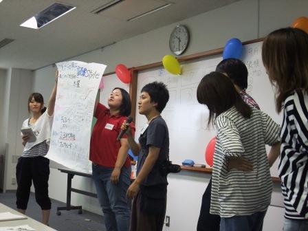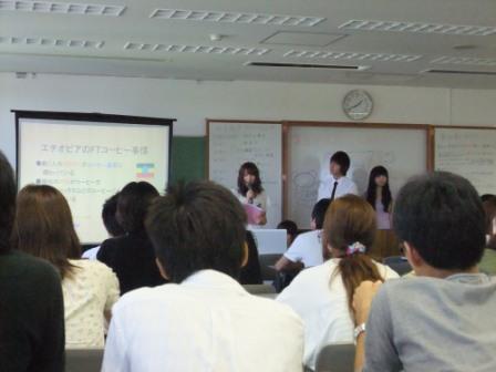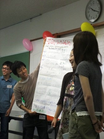 朝、6時半起床 ![]() グループワークの班で集まって会議。どう発表するかについてを話し合い★ 9時から開始!まずはサプライズ企画。繋ぎ絵。・・・でいいのかな!? 頭・胴・足の3つをそれどれが書いて繋ぎ合わせるというもの。 お題は「秋葉原にいそうなせんとくん」 お題が面白い^^ 関東と関西の融合だし! うちらのせんとくんはこうなりました。 かれはうちにいます。(笑) もう1つのお題は「海で遊んでいる松潤ににているドラえもん」(だったかな?) これはどの班も眉毛が特徴的だった ![]() そしてついに、グループワーク発表へ。 どのようにフェアトレードを広めていけばいいかを、 対象を小学校以下、中高生、大学生、社会人に分け、アクションプランを発表します! まずは小学生以下対象グループ 1 1、「FairTradeを給食にin小学校」 給食にフェアトレード商品導入 2、「Trick or Trade」ハロウィンパーティーにFT商品を 3、「2人で出来るもん」親子で料理教室&フェアトレンジャー 中高生対象グループ 1 1、「おいしく学ぼうフェアトレード」 家庭科でカレー作り 2、「熱闘フェアトレード甲子園」 甲子園にフェアトレードコーヒーを 3、「フェアガール」 女子高生にフェアトレード商品を 大学生対象グループ 1 1、「アイドルだってフェアトレード」 フェアトレードを勧めるご当地アイドル 2、 「FTG47」 フェアトレードアイドルをイベントで起用 2、「これからの男子読書Style」 本屋にFTチョコレートとしおりを
